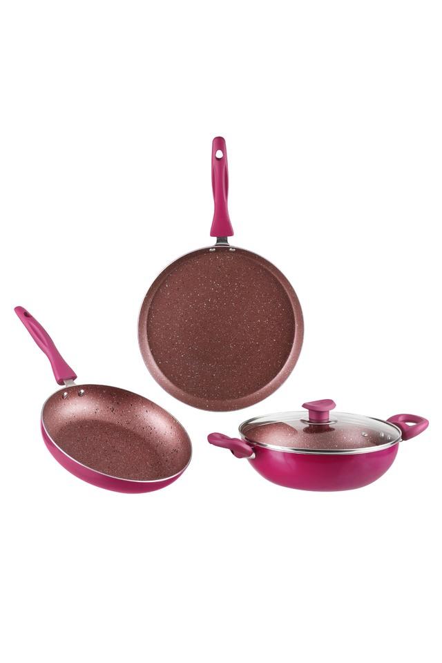 Lilac Non Stick 3 Pcs Cookware Set Frypan 24 cm and Kadai 24 cm 2.4 Litres with a Common Glass Lid and Dosa Tawa 28 cm Riveted Bakelite Soft Very well made.