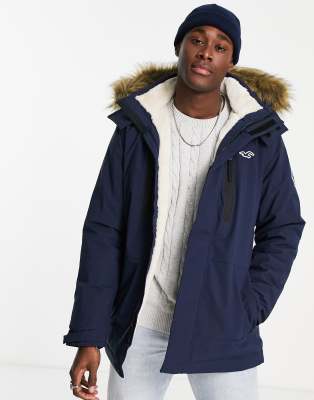 Hollister faux fur trim hooded heavyweight parka coat in navy ASOS Very well made.